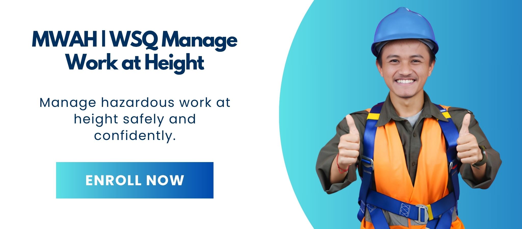The WSQ Manage Work at Height (MWAH) course equips professionals with the competence to plan, supervise, and manage high-risk work at height activities. It is aligned with the WSH (Workplace Safety and Health) Regulations in Singapore, covering essential control frameworks for regulatory compliance.