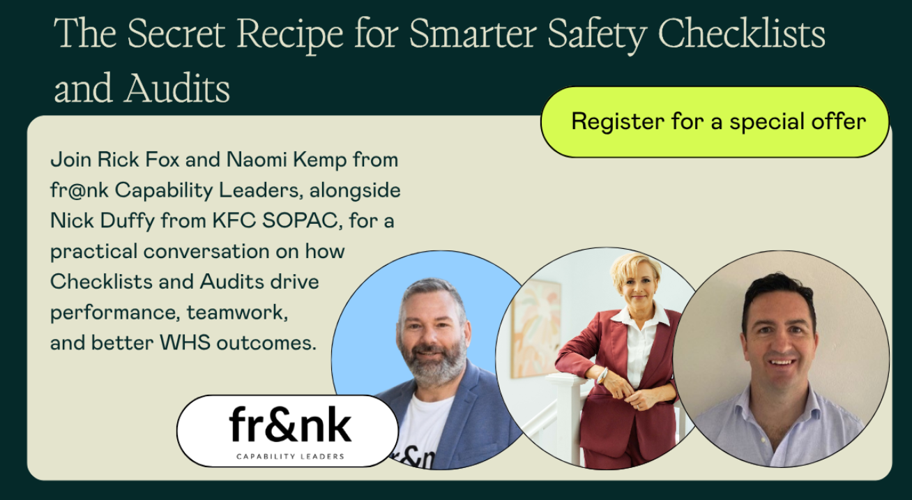 Join us for our upcoming webinar hosted by our partners fr&nk Capability Leaders, The Secret Recipe for Smarter Safety Checklists and Audits, on Thursday 30 April at 12pm AEST / 2pm NZST.