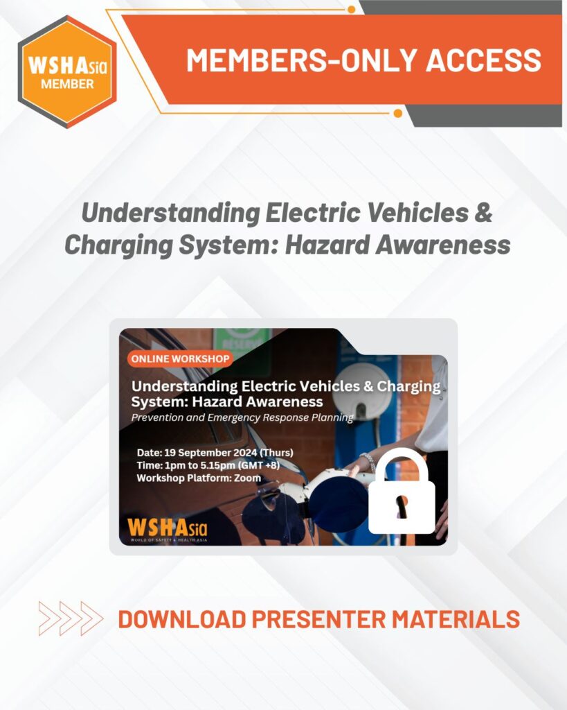 Organised by WSHAsia in 2024, this highly rated session provided practical insights into the growing use of electric vehicles in modern workplaces. Participants learned about how electric vehicle systems operate, identified common and emerging hazards associated with EV maintenance and charging infrastructure, and explored proactive risk management approaches. The workshop also highlighted critical safety considerations, including electrical risks, thermal runaway events, and safe emergency response practices when dealing with EV-related incidents.