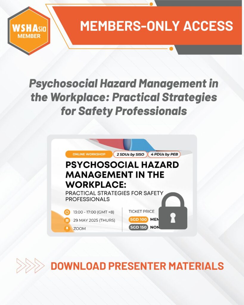 Curated with insights from industry experts and organised by WSHAsia, this important session explored the growing significance of managing psychosocial risks in modern workplaces. The workshop delved into how work-related stressors, organisational pressures, and interpersonal dynamics can influence employee well-being and overall safety performance.